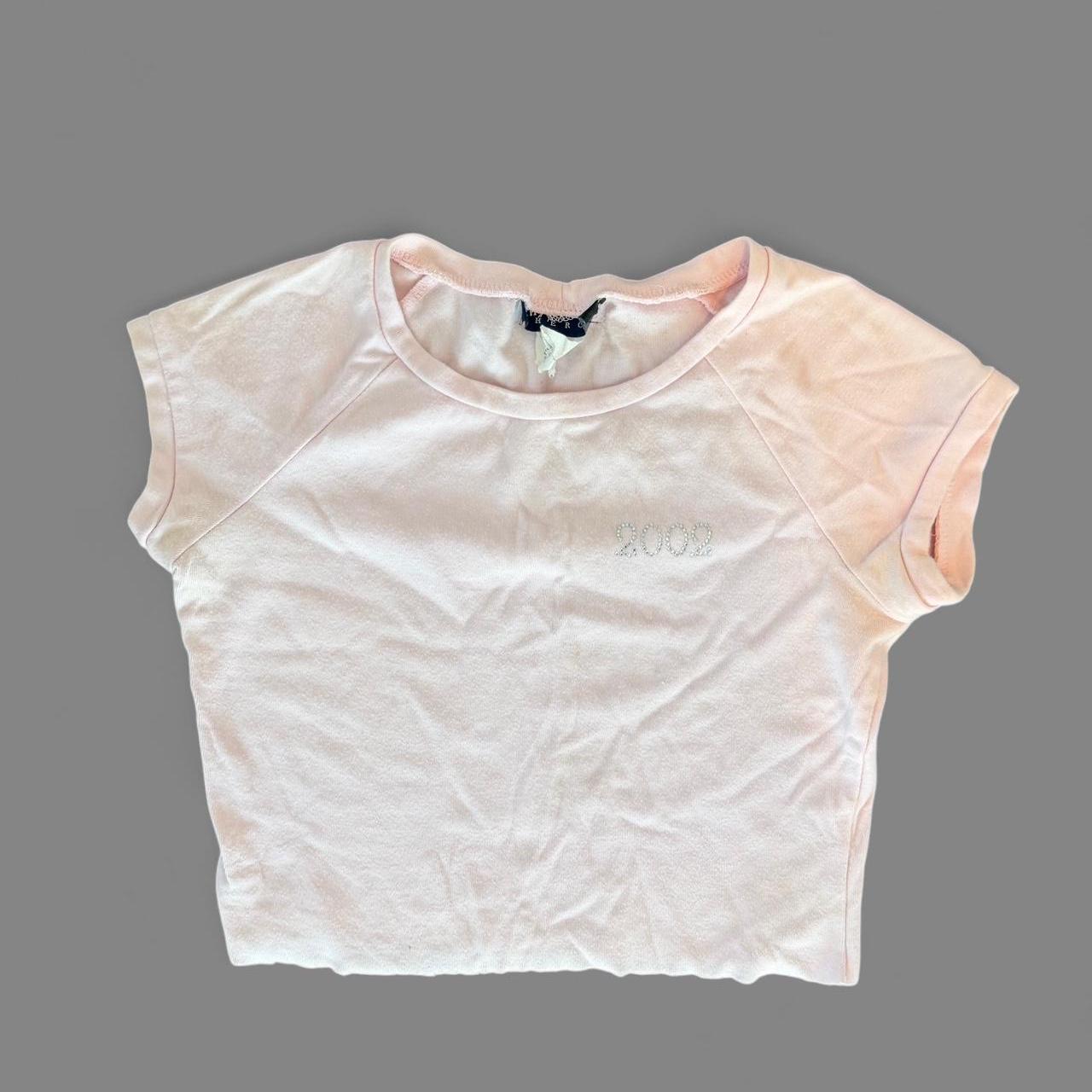 تيشيرت قصير وردي فاتح لطيف مزين بأحجار الراين اللامعة التي تحمل الرقم "2002". مصنوع من القطن الناعم، بأكمام قصيرة، ويحمل طابع أوائل الألفية الجديدة، ويتناسب تماماً مع الجينز منخفض الخصر أو التنورة القصيرة.