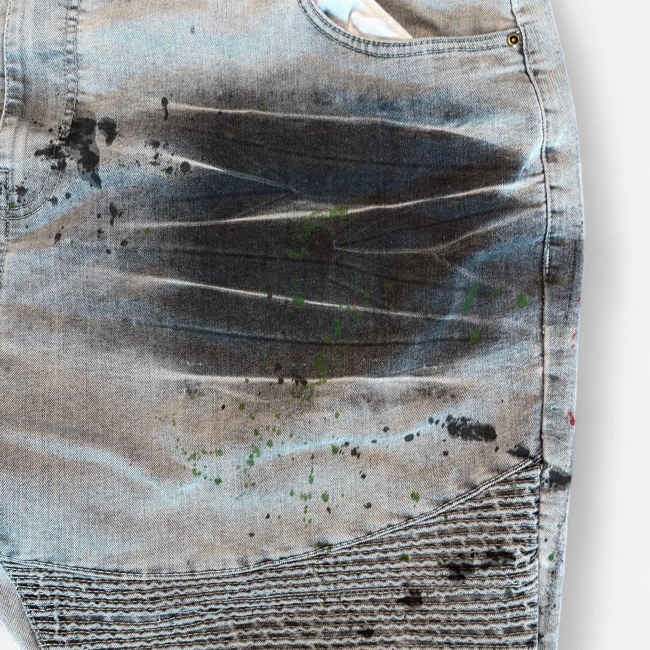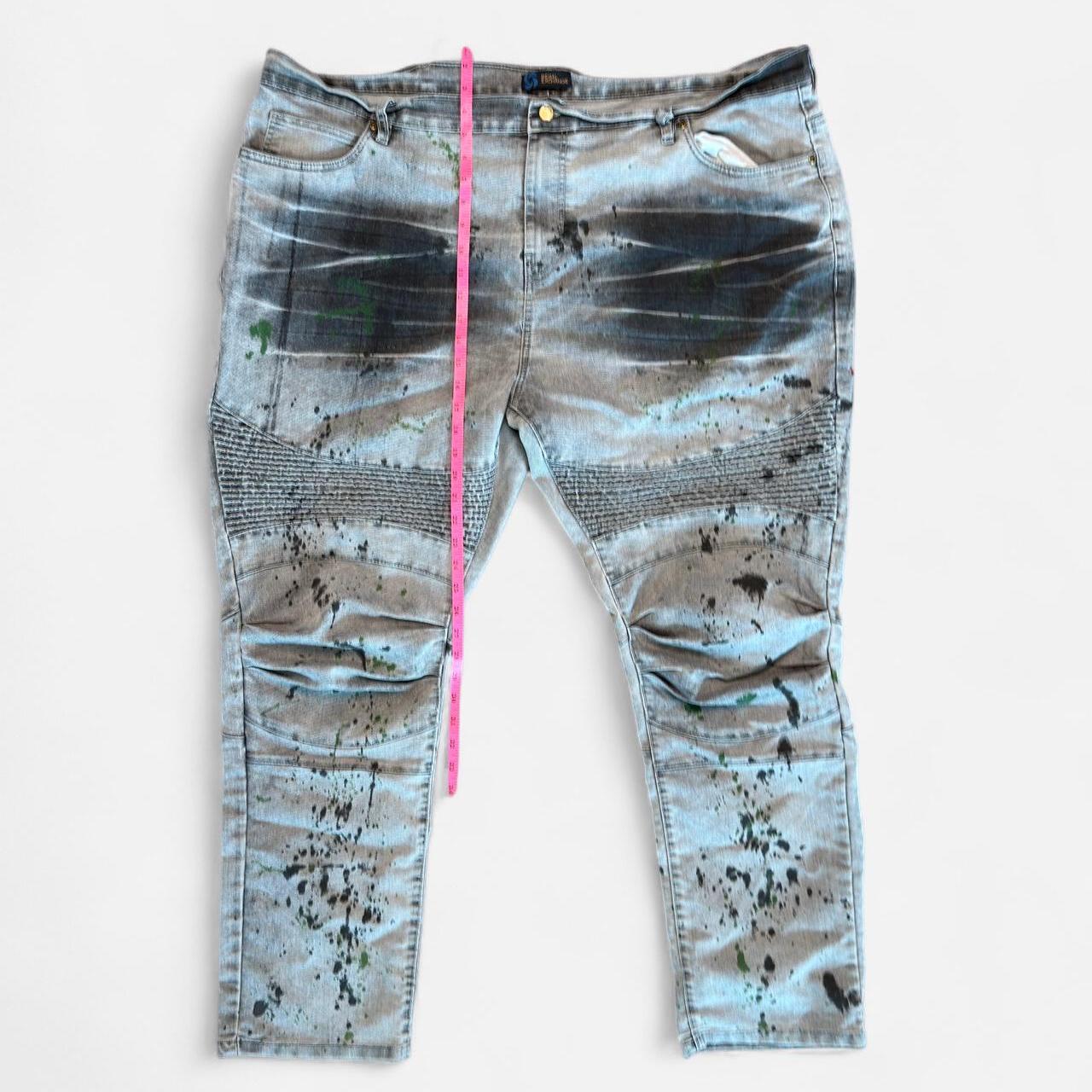رذاذ طلاء، تصميم ممزق، مقاس كبير، طراز الدراجات النارية، تصميم طليعي، جينز مصقول، لون رمادي فاتح، ركبة مضلعة، جمالية استوديو فني، تفاصيل جريئة