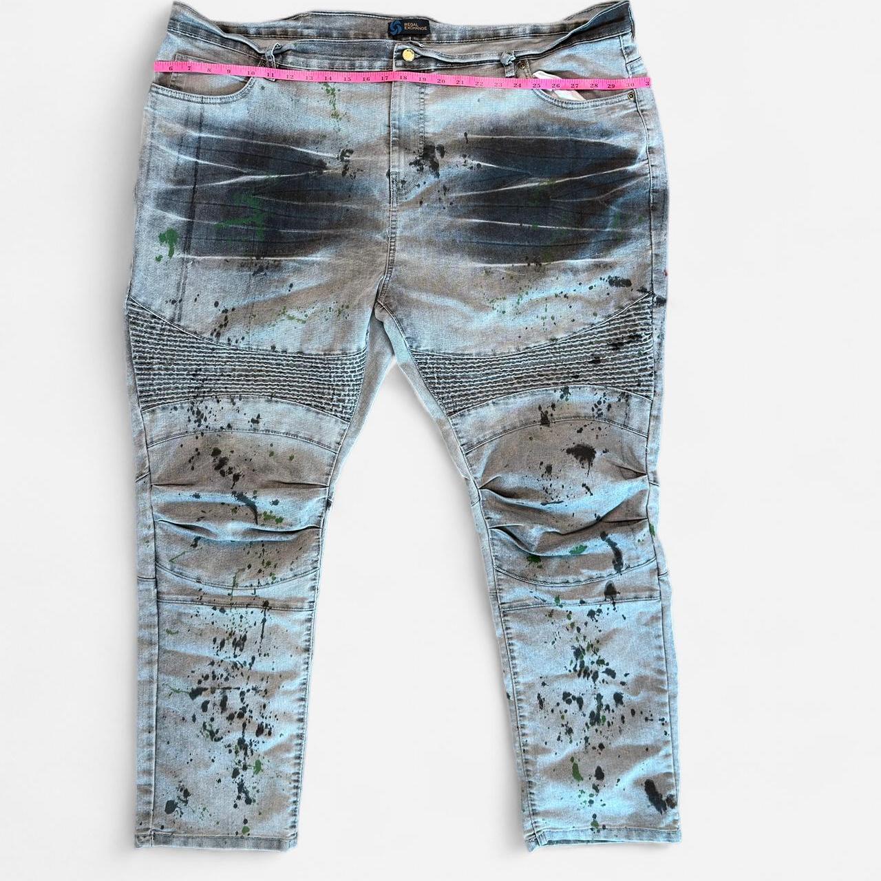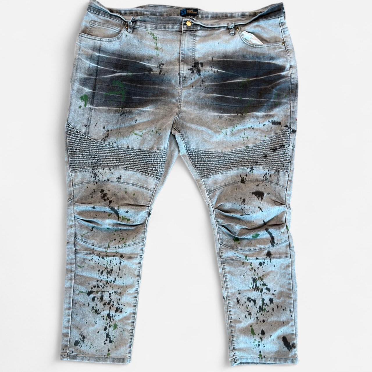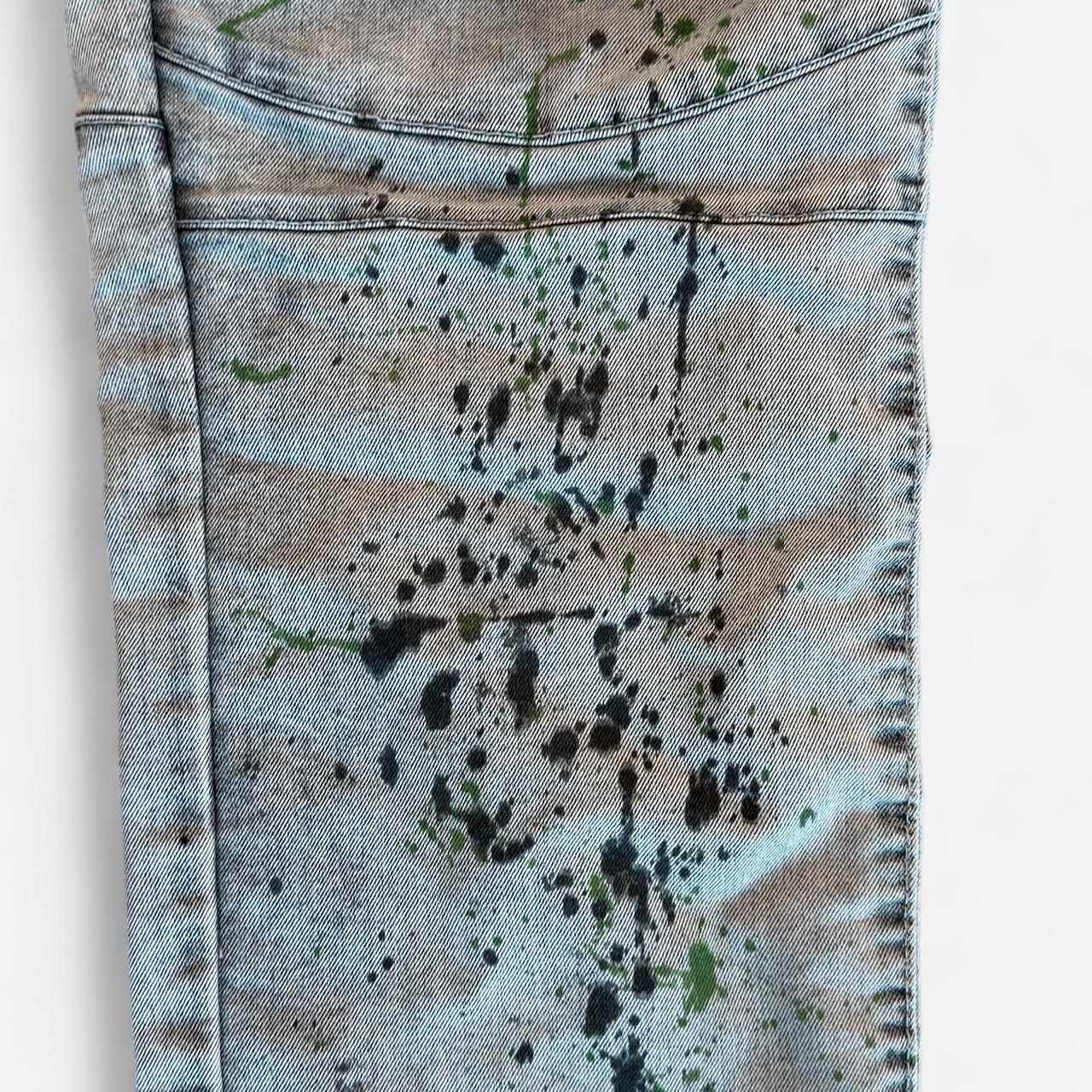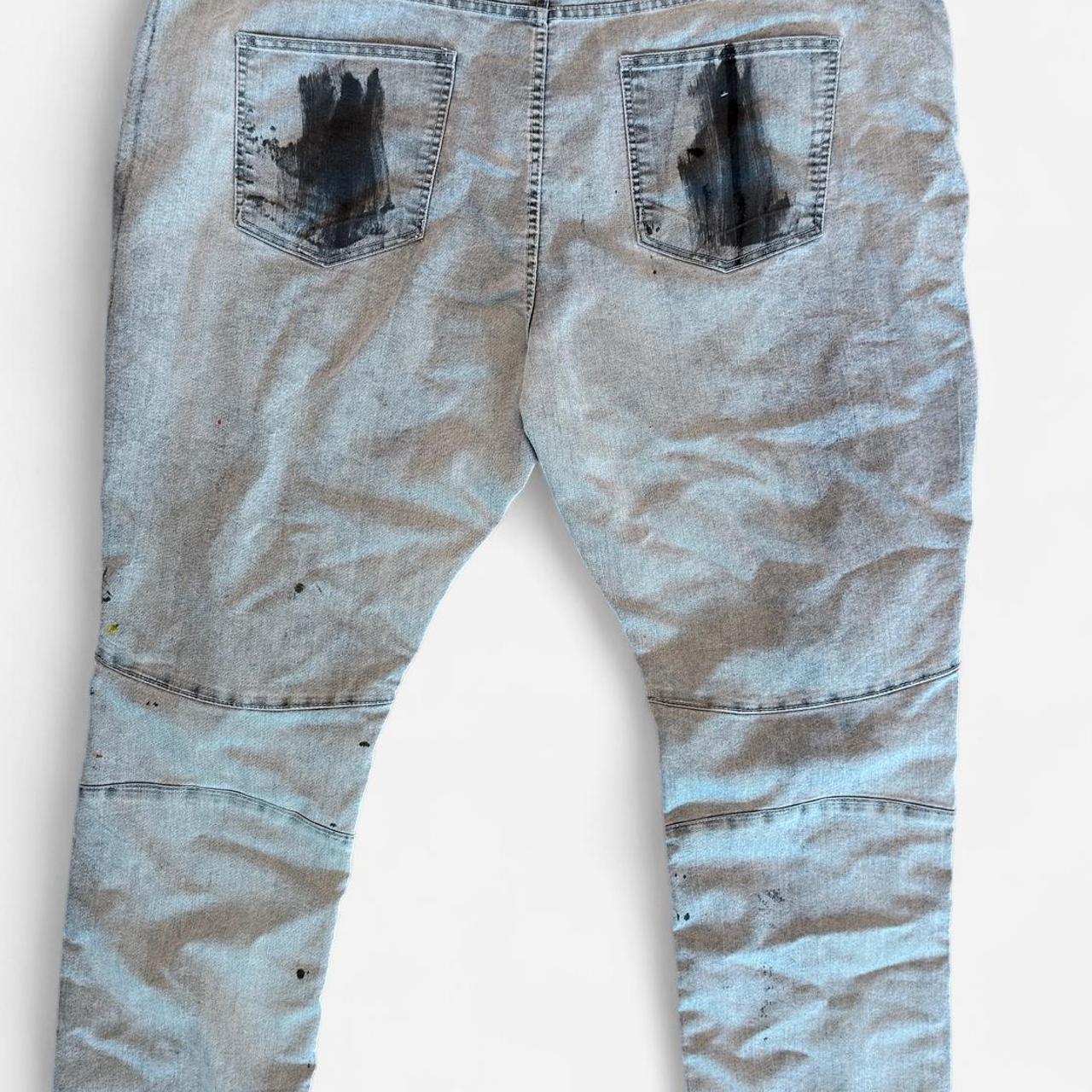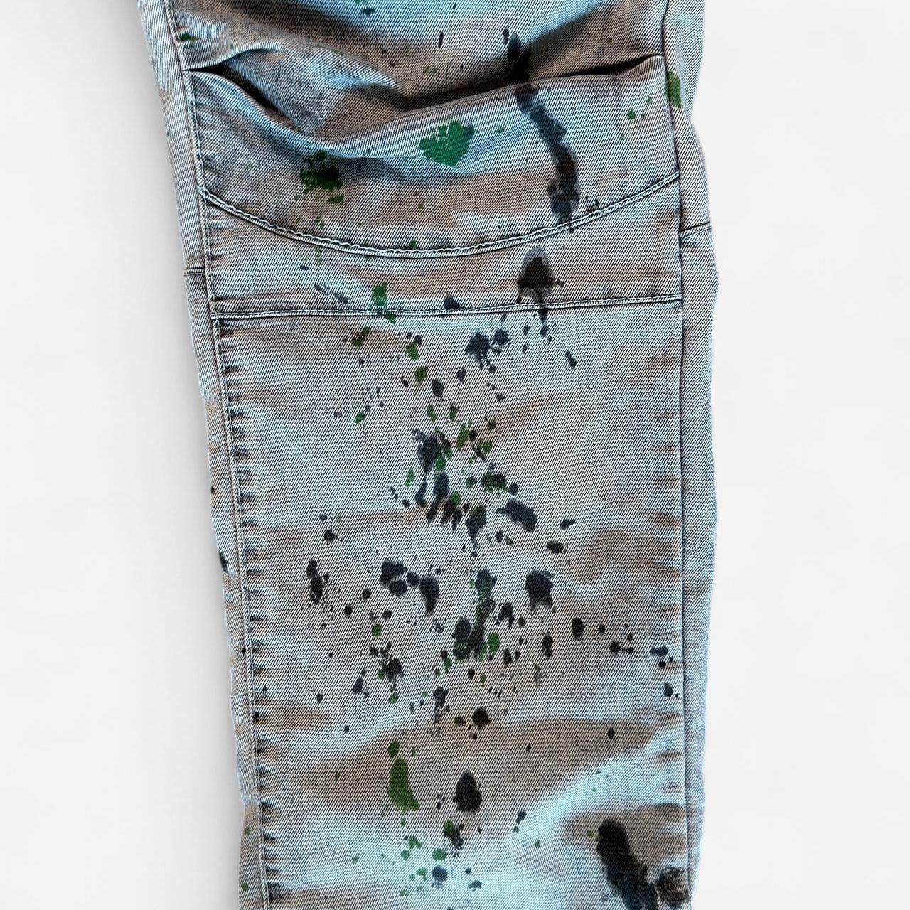 🔥 بنطال جينز واسع من ماركة Regal Exchange بتصميم دراجات نارية، يتميز بتفاصيل ممزقة مرسومة يدويًا وألواح ركبة مضلعة. قاعدة رمادية مغسولة مزينة ببقع من الصبغة السوداء والخضراء، مما يخلق جمالية فنية طليعية مستوحاة من استوديوهات الفنون، تعكس روح علامتي Amiri وPurple Brand.