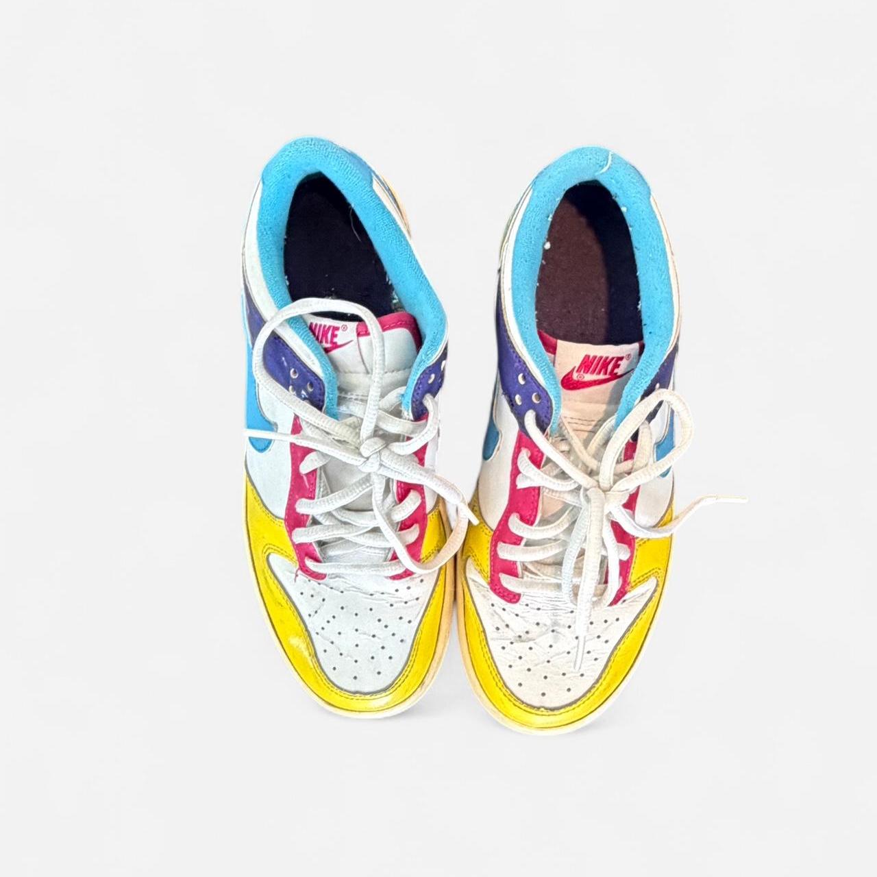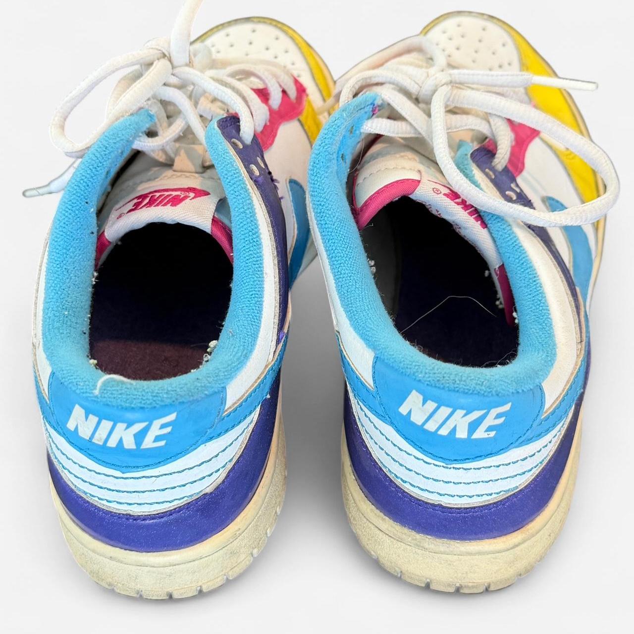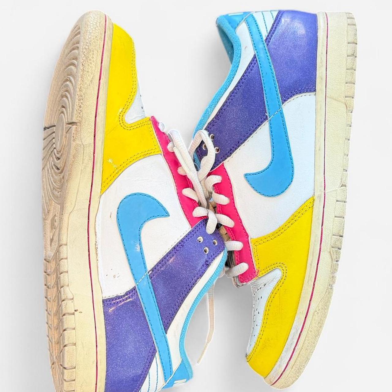 حذاء نايكي دانك لو مميز بتصميم جريء متعدد الألوان. يتميز بألواح من الجلد الأصفر والأزرق والبنفسجي والوردي والأبيض لإضفاء لمسة كلاسيكية أصيلة. حذاء رياضي أنيق وجذاب، مثالي لإضافة لمسة لونية مميزة لأي إطلالة.