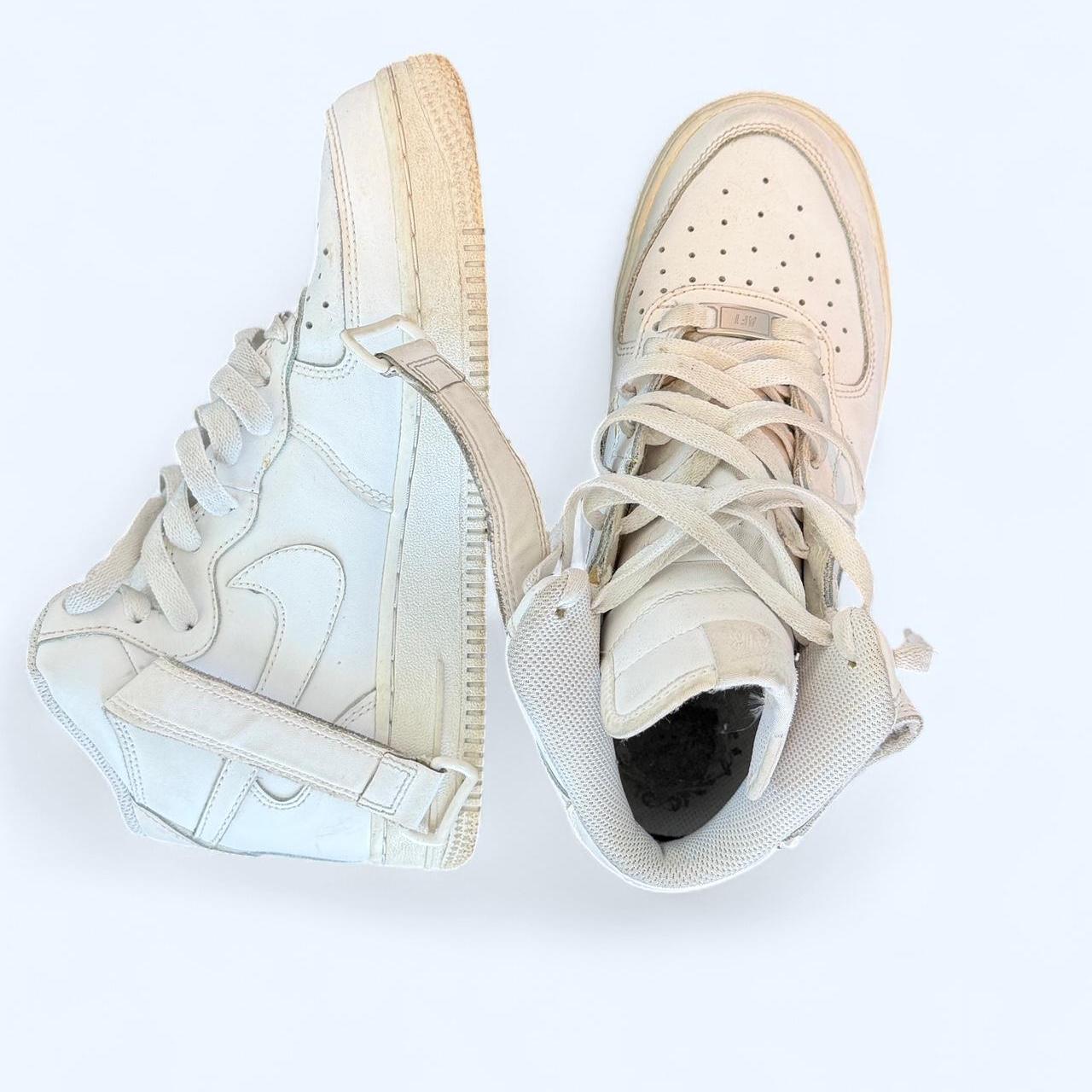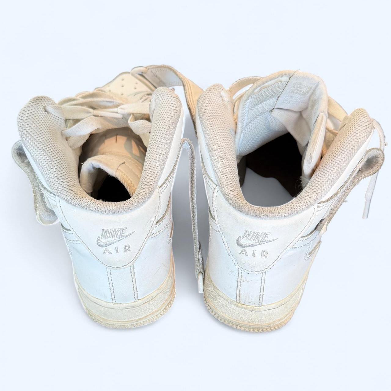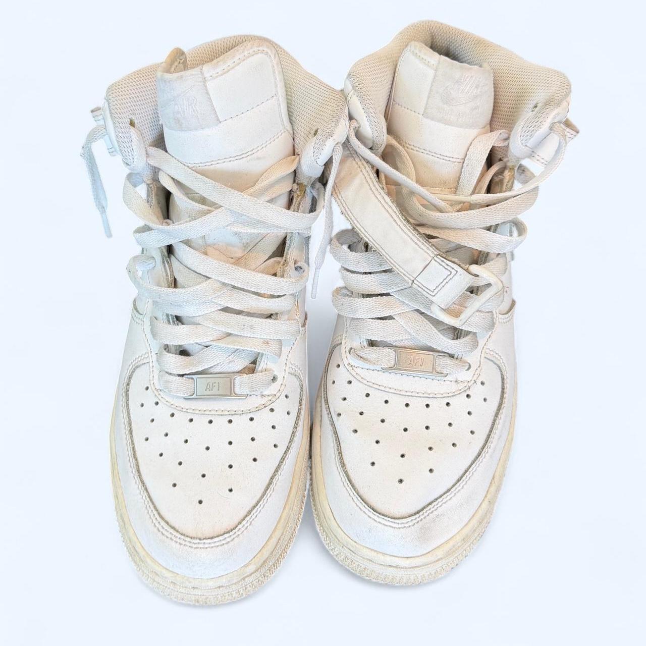 حذاء نايكي إير فورس 1 هاي الكلاسيكي باللون الأبيض بالكامل. يتميز بجزء علوي من الجلد، وحزام للكاحل، ومقدمة مثقبة، ونعل مطاطي متين.