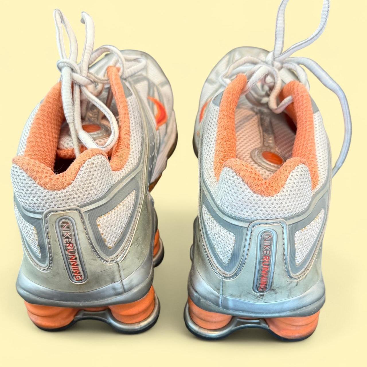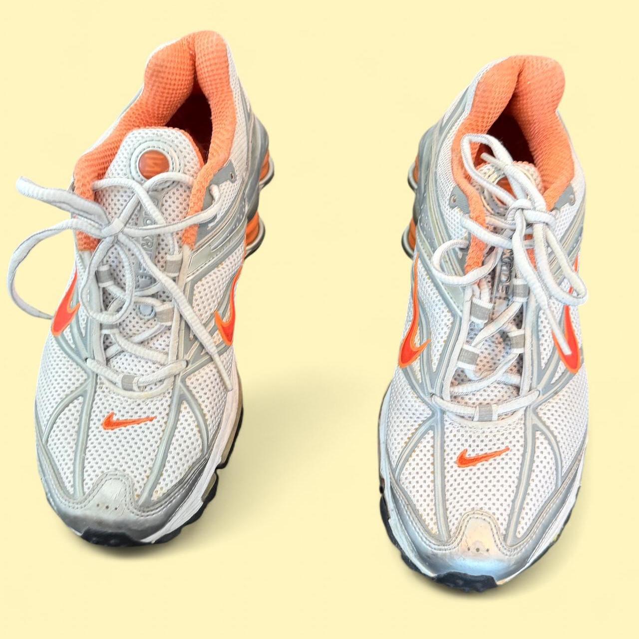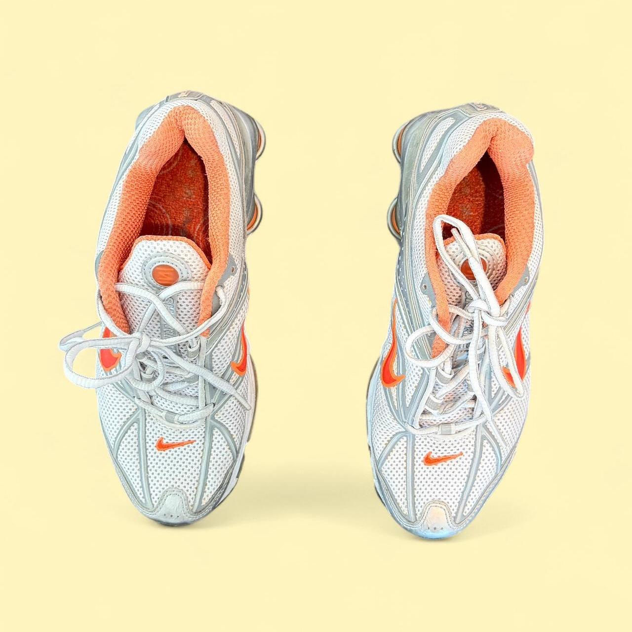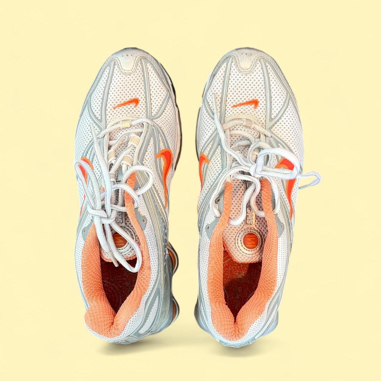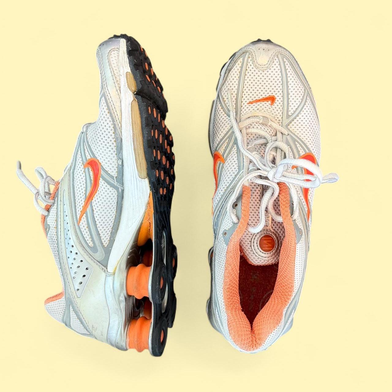 ✨ التفاصيل: حذاء نايكي شوكس كلاسيكي مزود بدعم مبطن للكعب، وجزء علوي شبكي للتهوية، وتفاصيل برتقالية جريئة. تصميم مستوحى من موضة أوائل الألفية الجديدة، يعود بقوة. به بعض آثار الاستخدام كما هو موضح في الصورة، لكنه لا يزال بحالة جيدة. مثالي لإطلالات الشارع أو الإطلالات الرياضية ذات الطابع الكلاسيكي.