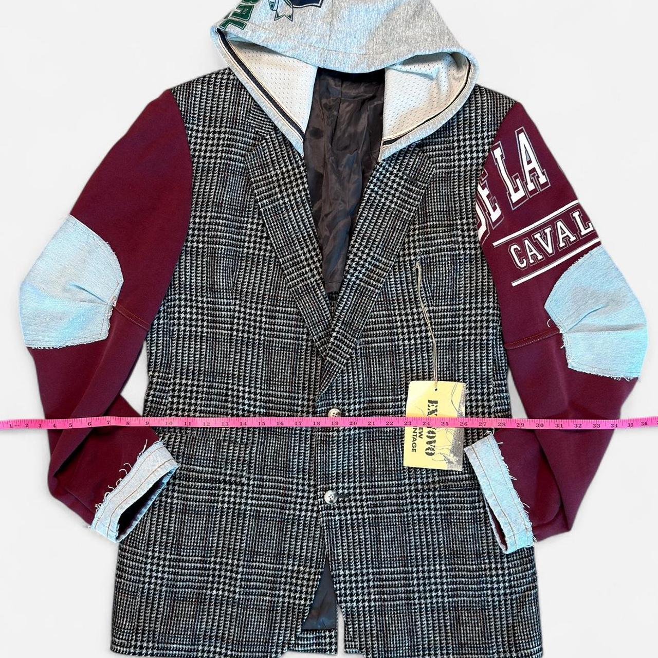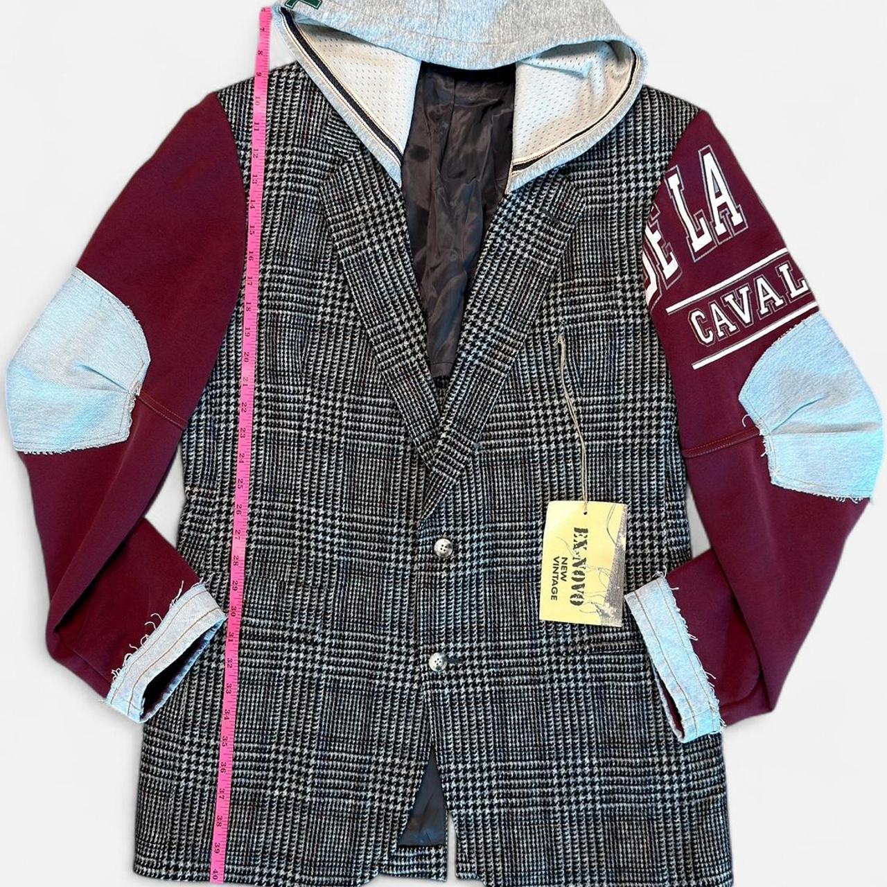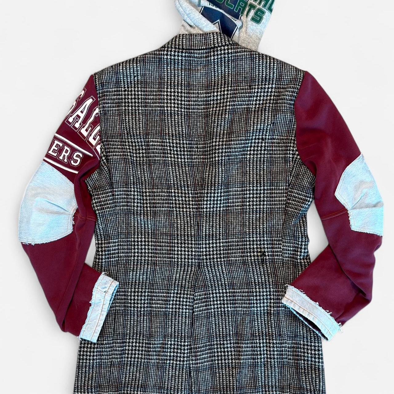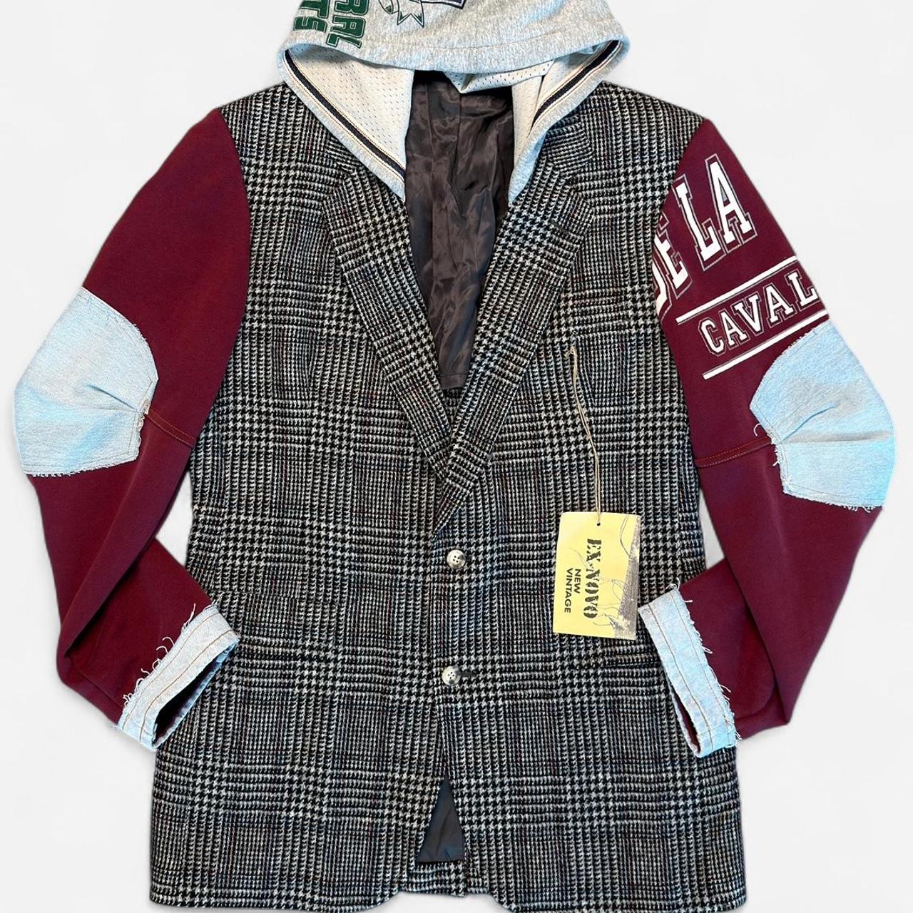 🔥 جاكيت بليزر فريد من نوعه، مُعاد تصميمه ليجمع بين أناقة الخياطة الكلاسيكية ولمسة عصرية جريئة. يتميز بجسم بليزر بنقشة مربعات هاوندستوث، وأكمام مرقعة، وتفاصيل من الدنيم الخام، وغطاء رأس مُصمم خصيصًا - مزيج مثالي بين الأناقة الكلاسيكية والعصرية الجرونجية.