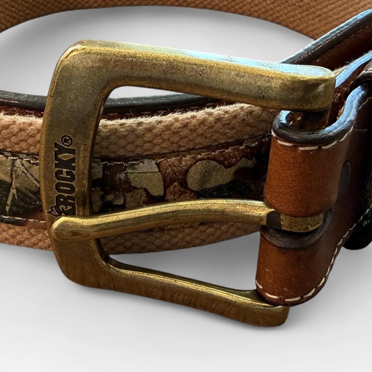 حزام من ماركة Rugged Rocky مصنوع من قماش مموه مع لمسات جلدية وإبزيم من النحاس المصقول. قطعة متعددة الاستخدامات، مثالية للأنشطة الخارجية، تجمع بين الطابع الأمريكي الكلاسيكي والأسلوب العملي.