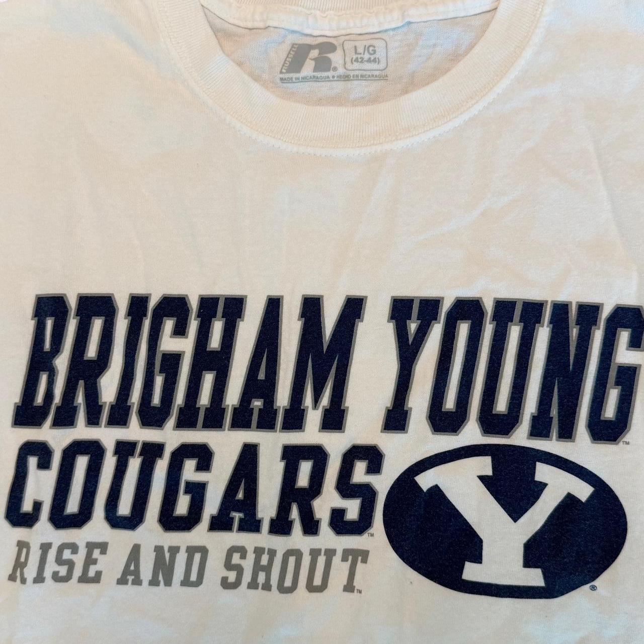 Classic vintage Brigham Young University Cougars tee featuring bold collegiate lettering and the iconic BYU “Y” logo with Rise and Shout slogan. Clean, timeless college sportswear piece with a naturally worn-in feel.
