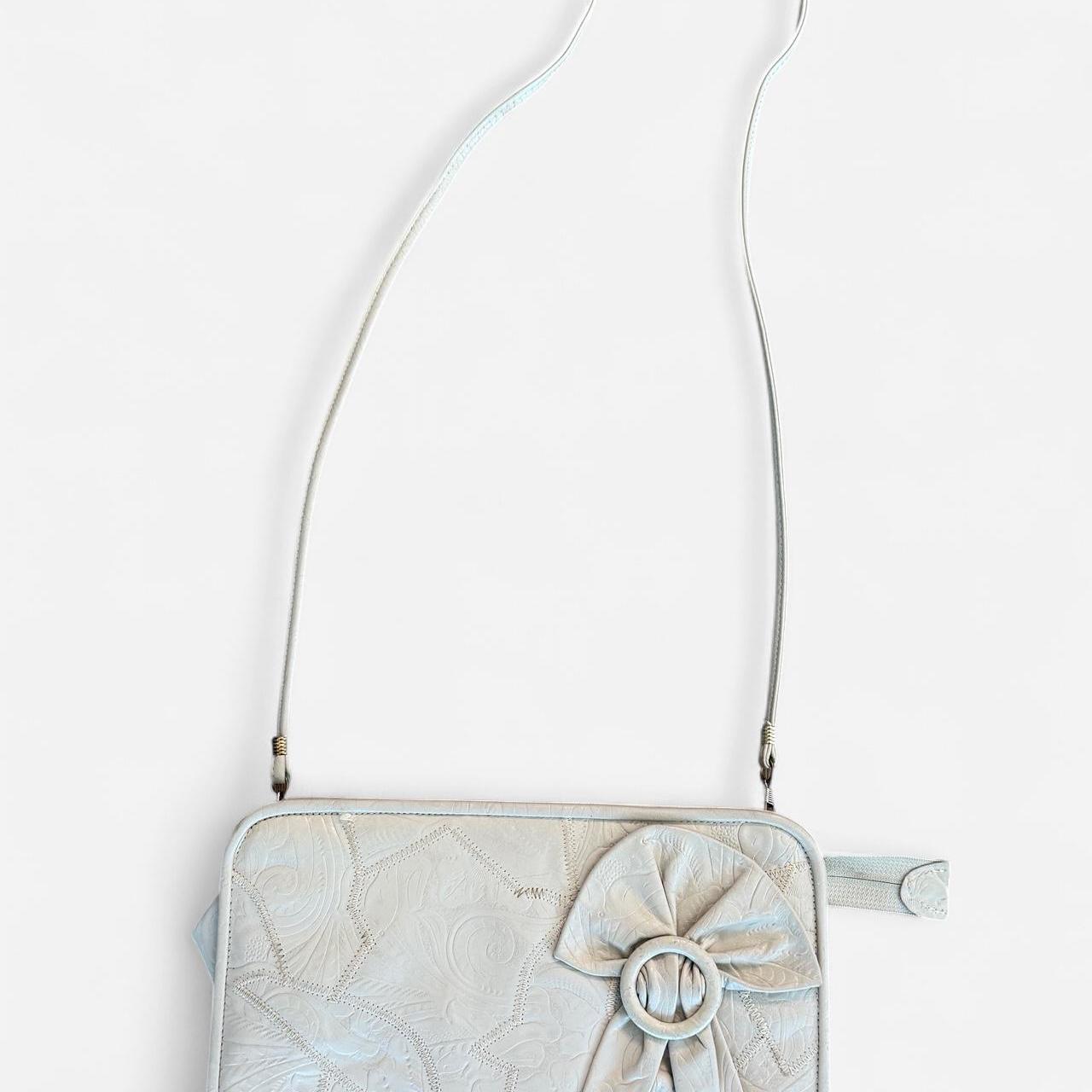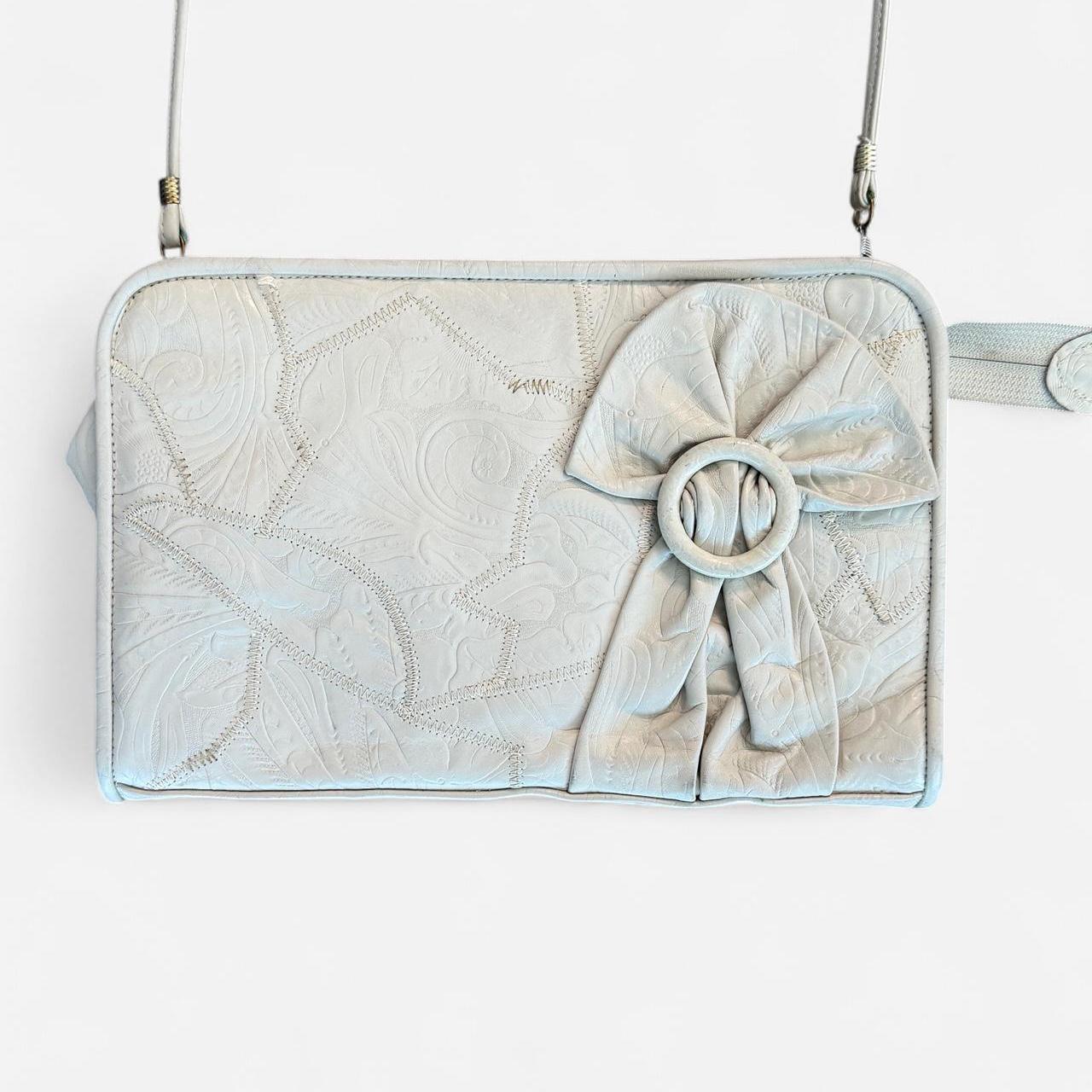 حقيبة يد أنيقة بلون كريمي مصنوعة من الجلد الصناعي، تتميز بتصميم زهري ناعم منقوش، وزينة على شكل فيونكة مطوية مع حلقة. يمكن ارتداؤها كحقيبة كتف بفضل الحزام القابل للفصل، أو حملها كحقيبة يد لإطلالة أنيقة وبسيطة. مثالية للمناسبات الرسمية أو الإطلالات المستوحاة من الطراز القديم.