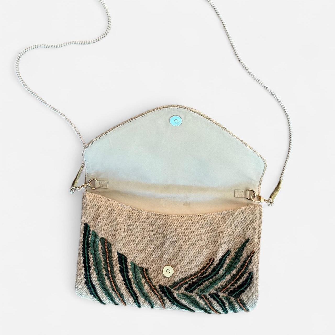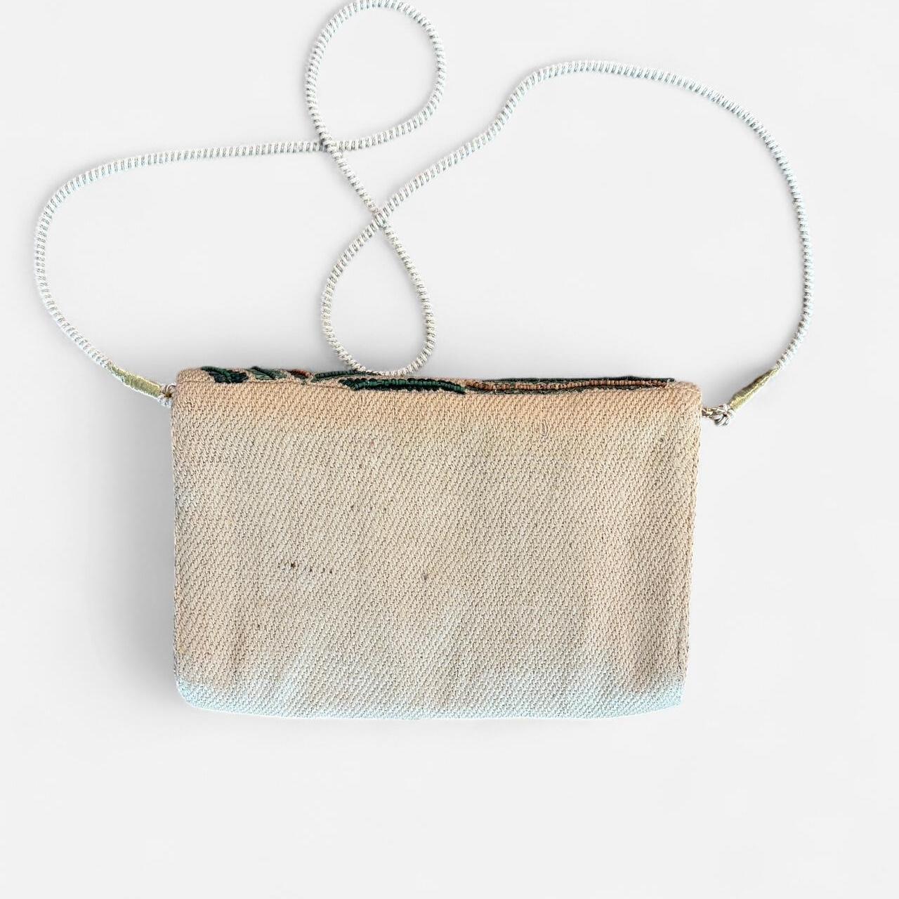 حقيبة يد كروسبودي عتيقة رائعة مزينة بالخرز، تتميز بنقوش أوراق خضراء وذهبية متقنة على قاعدة كريمية اللون. تأتي مع سلسلة ذهبية رقيقة يمكن طيها داخل الحقيبة لارتدائها كحقيبة يد. يضفي تصميم غطاء الحقيبة لمسة من الأناقة العتيقة، مما يجعلها مثالية لإطلالة مسائية أو إطلالة نهارية مميزة.