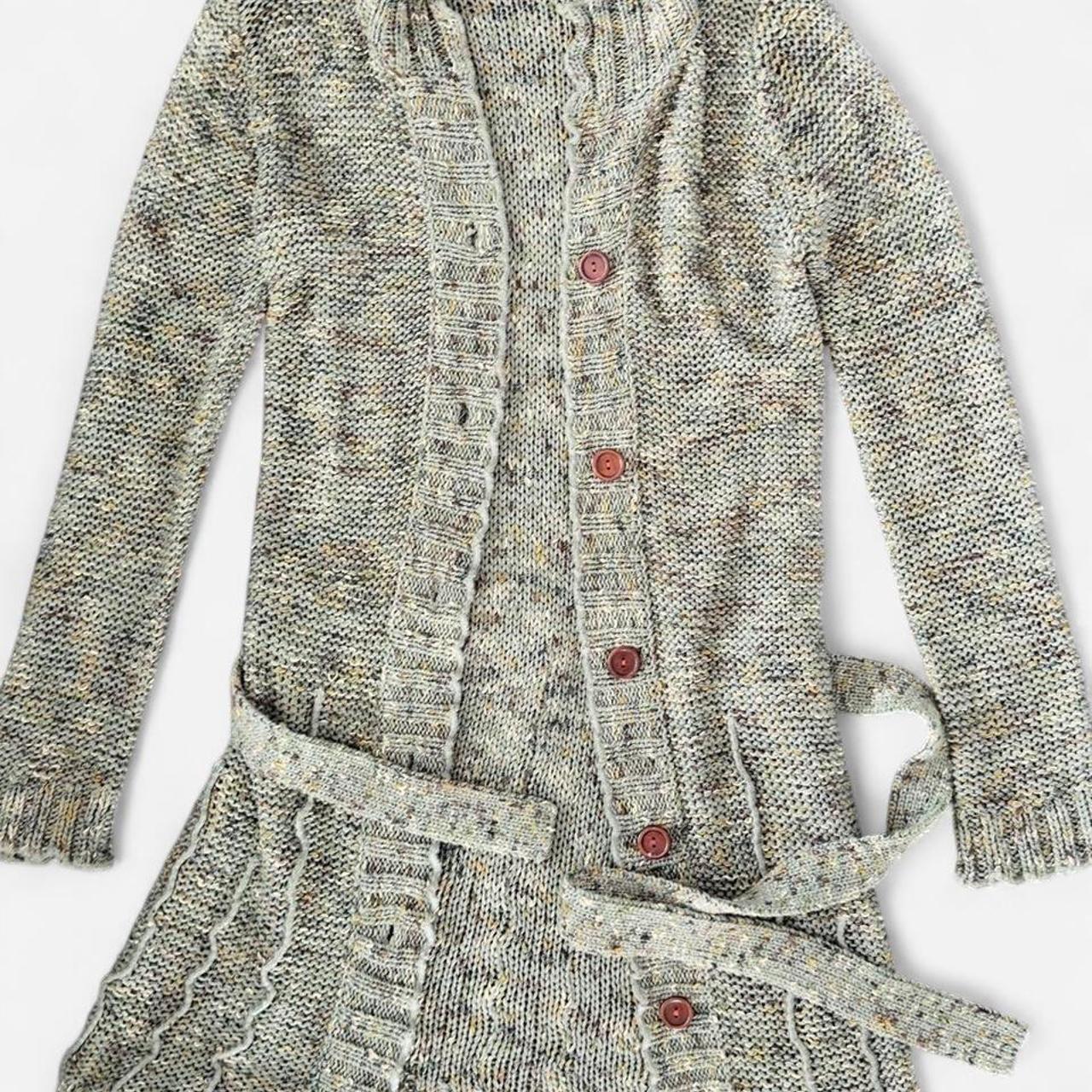 Elegant and cozy BCBG Max Azria longline cardigan with textured knit detailing and a ruffled trim. Features button closure, detachable belt, and a flattering fit that gives total fall-layer energy. Neutral speckled tones make it perfect for styling over slip dresses, denim, or tailored pants.
