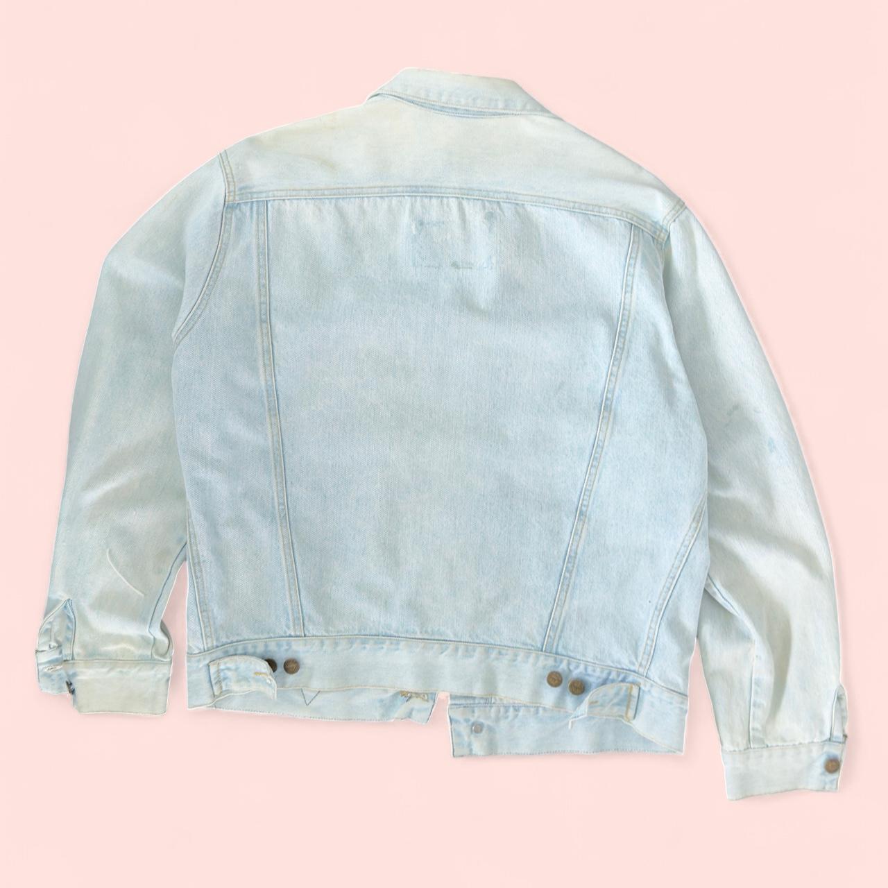 light wash denim, oversized jacket, triangle logo patch, button front, vintage-inspired, streetwear fashion, 90s nostalgia, layered look, casual outerwear, retro vibe