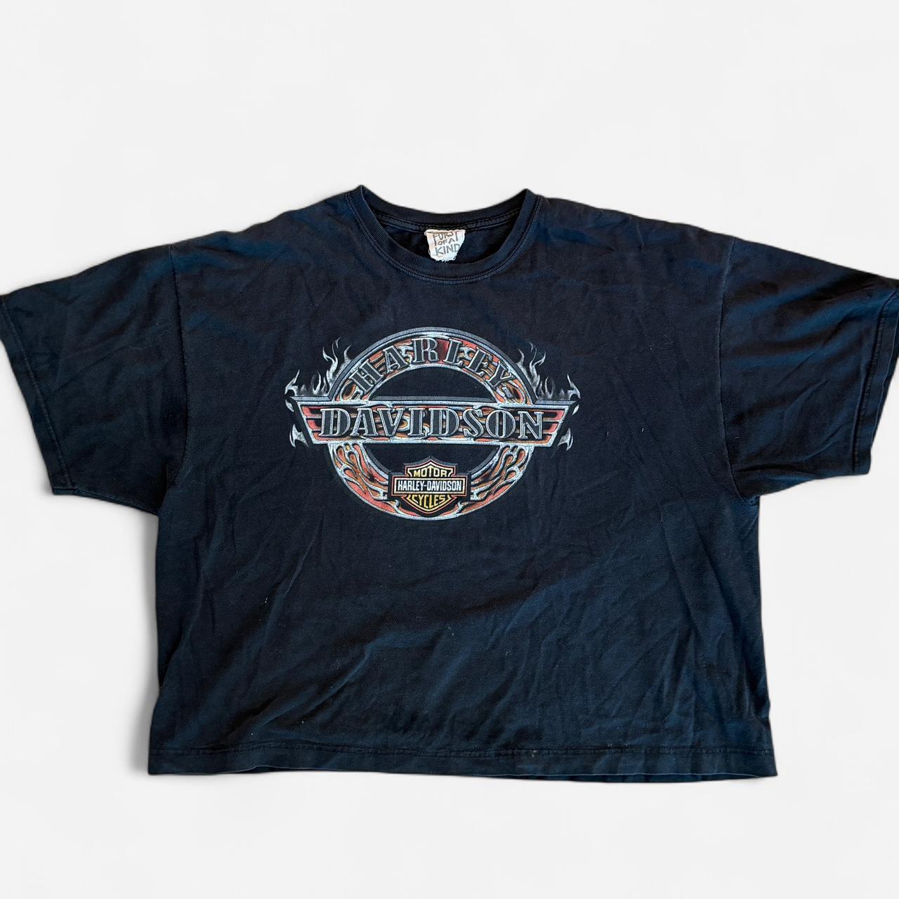 Classic black Harley tee featuring the iconic flame logo across the chest. Soft, broken-in cotton for that perfect vintage feel and cropped boxy fit.