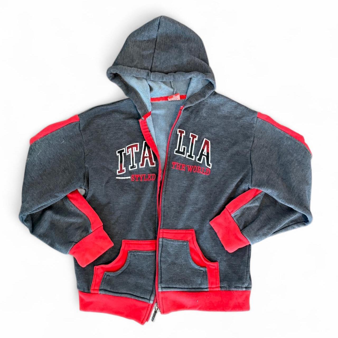 Retro kids zip-up hoodie in charcoal gray with bold red accents. “ITALIA” embroidered on the front, sporty graphic text on the back, and cozy red trim details. Lightweight and perfect for layering. Size 34 (kids).