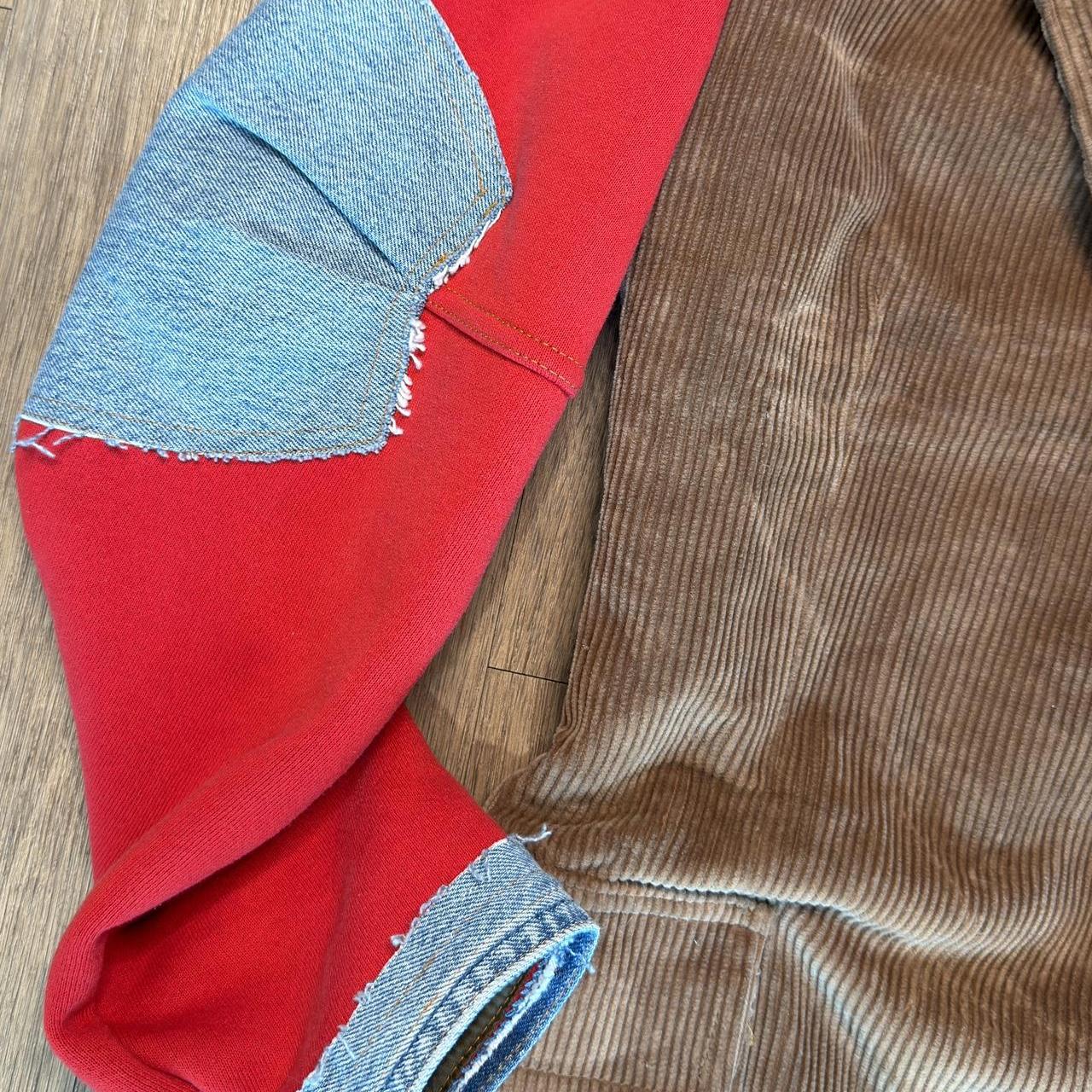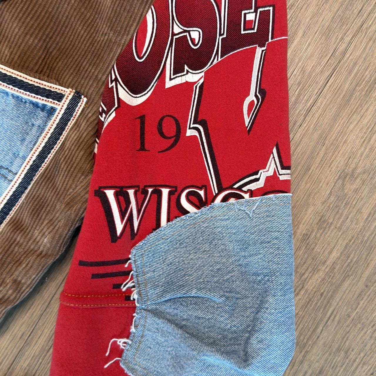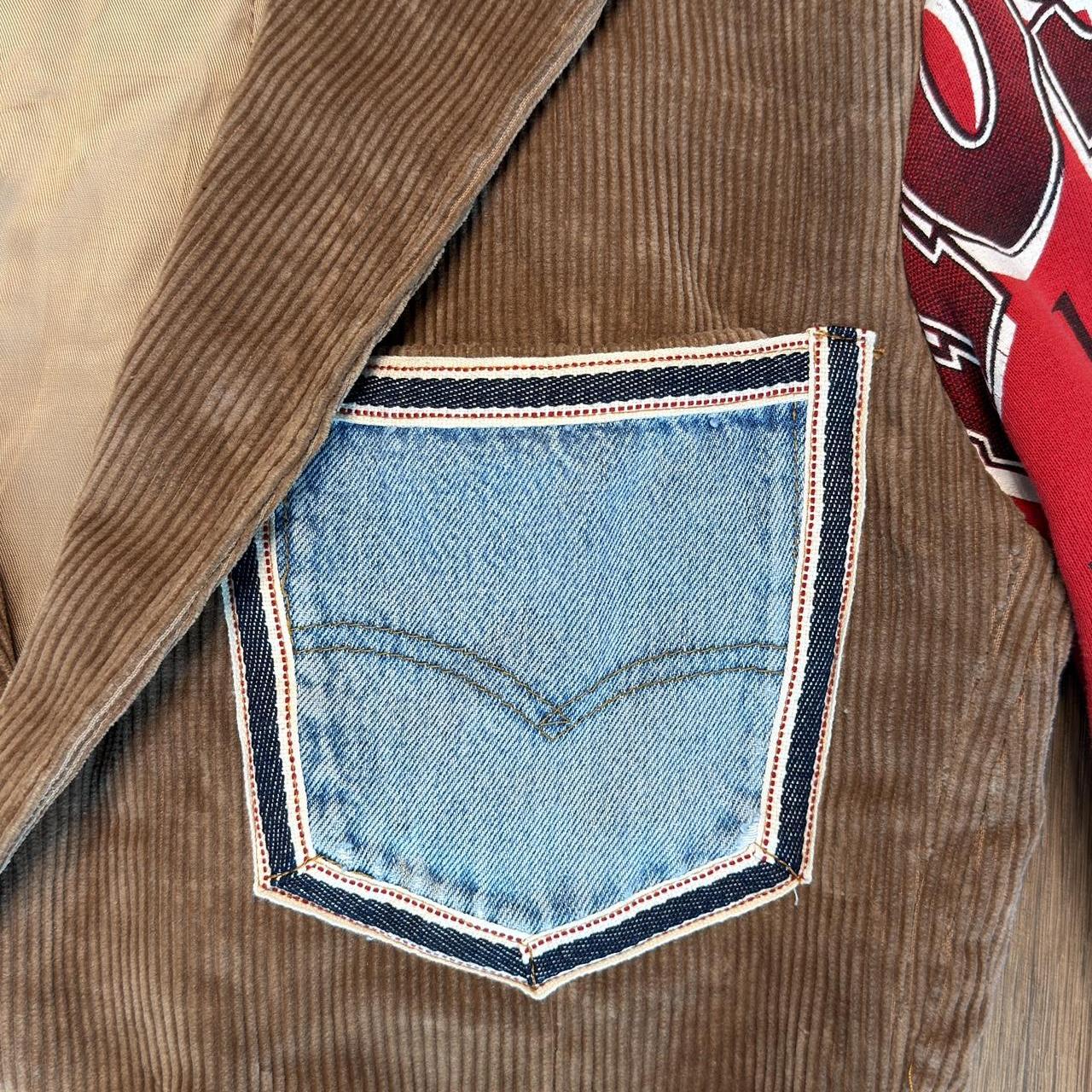 🔥 Rare Ex Novo New Vintage reconstructed blazer hoodie — combining a corduroy tailored jacket with collegiate sweatshirt sleeves and denim patchwork detailing. This one-of-one piece fuses heritage fabrics with streetwear energy — part Ivy League, part underground.