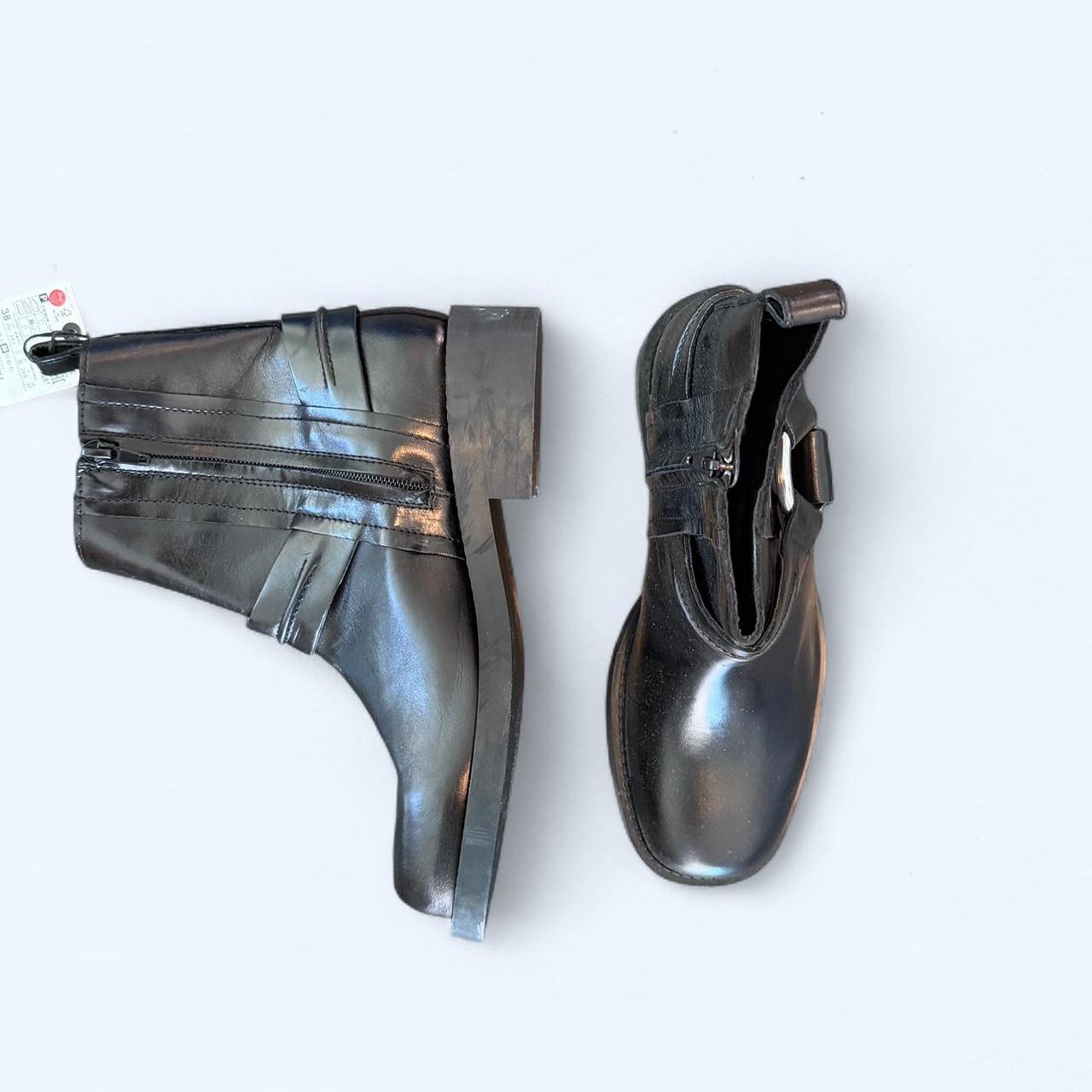 Step out in timeless style with these sleek ZARA ankle boots. Featuring smooth black leather, a bold harness strap detail with silver hardware, and a sturdy block heel, these boots are the perfect blend of edgy and classic. The square toe design gives them a modern finish, making them versatile enough to pair with jeans, dresses, or skirts.