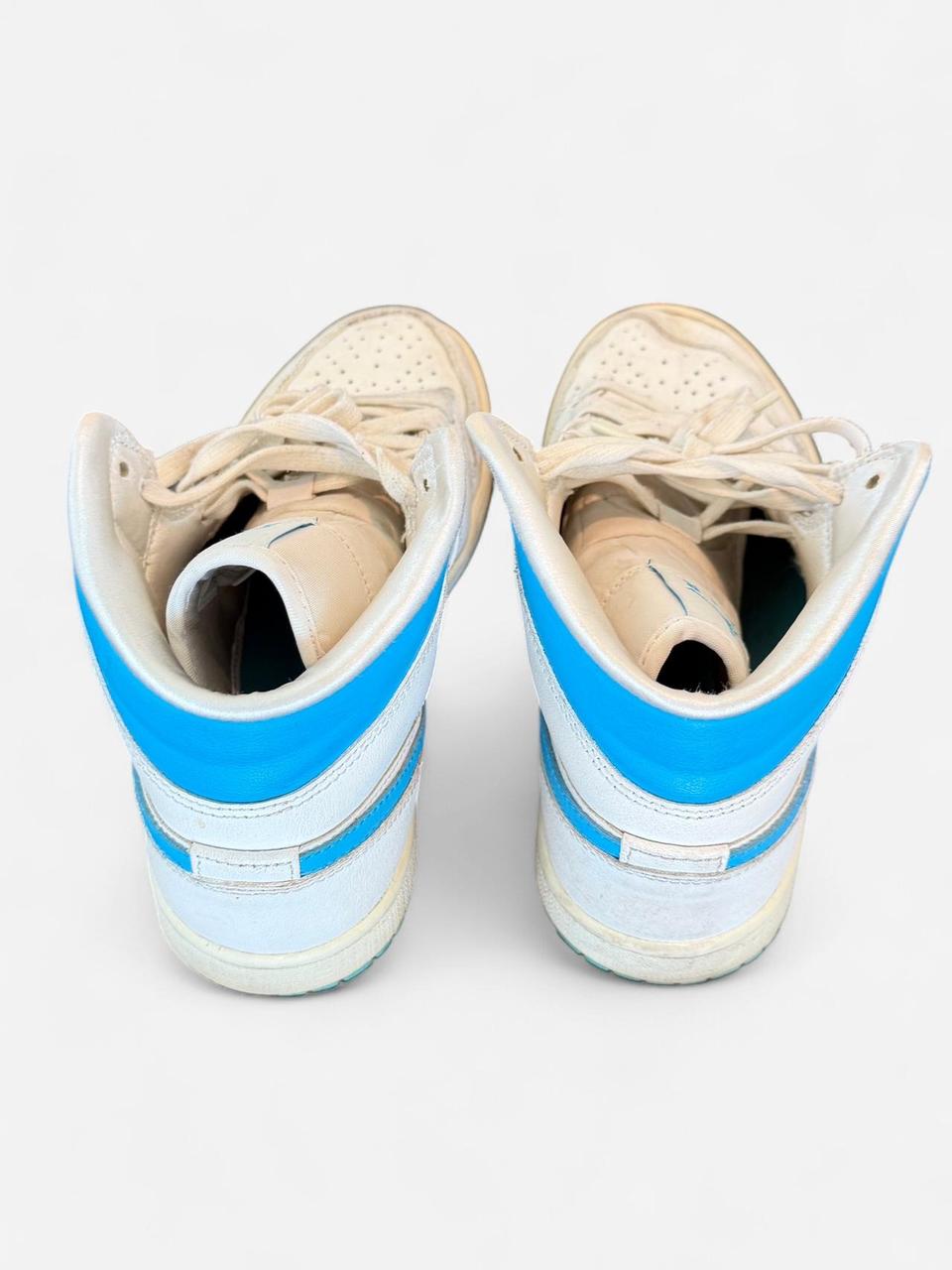 white leather, blue accents, high-top, air cushioning, perforated toe, sneaker silhouette, sporty, streetwear, casual kicks, retro style