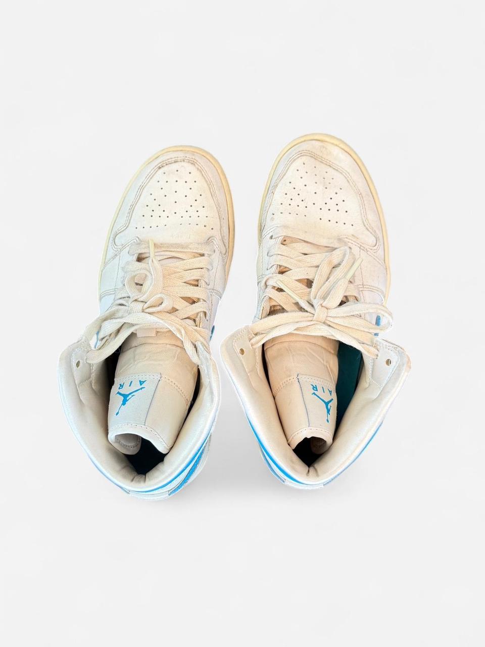 Nike Air Jordan 1 Mid White/Blue Classic Air Jordan 1 Mid in white leather with vibrant blue swoosh and detailing. Timeless high-top style with durable leather upper, perforated toe box, and cushioned sole for all-day comfort.