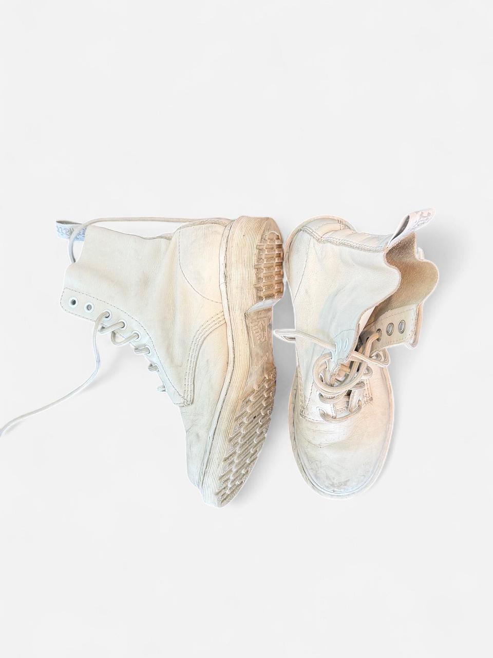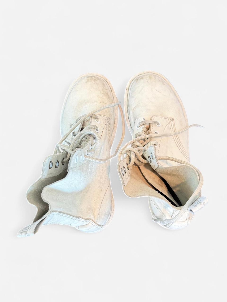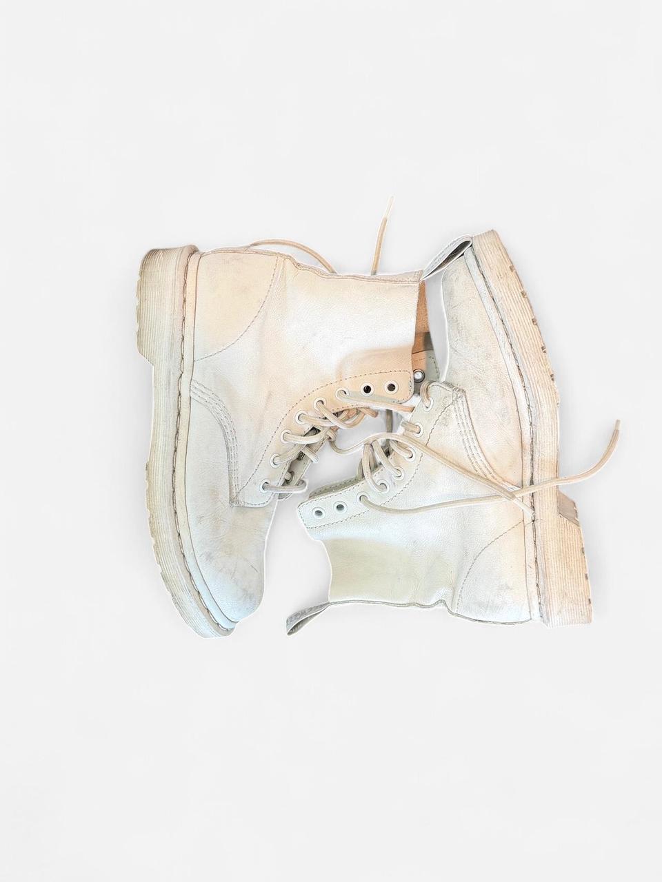 white leather, chunky boots, grunge footwear, punk-inspired, monochrome design, distressed style, platform sole, 8-eyelet, durable leather, casual alternative