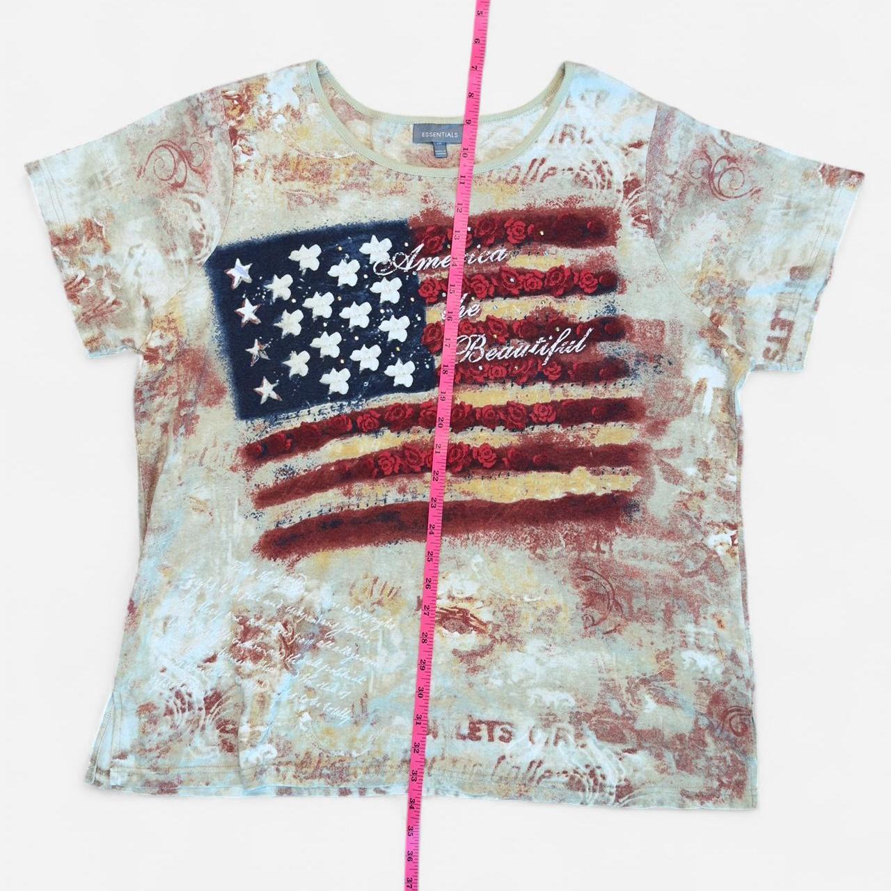 Patriotic vintage-style Essentials tee featuring a distressed American flag graphic with embroidered stars and textured red rose detailing. Soft, lived-in feel with an all-over washed print. Perfect for Y2K Americana, vintage streetwear, or July 4th fits.