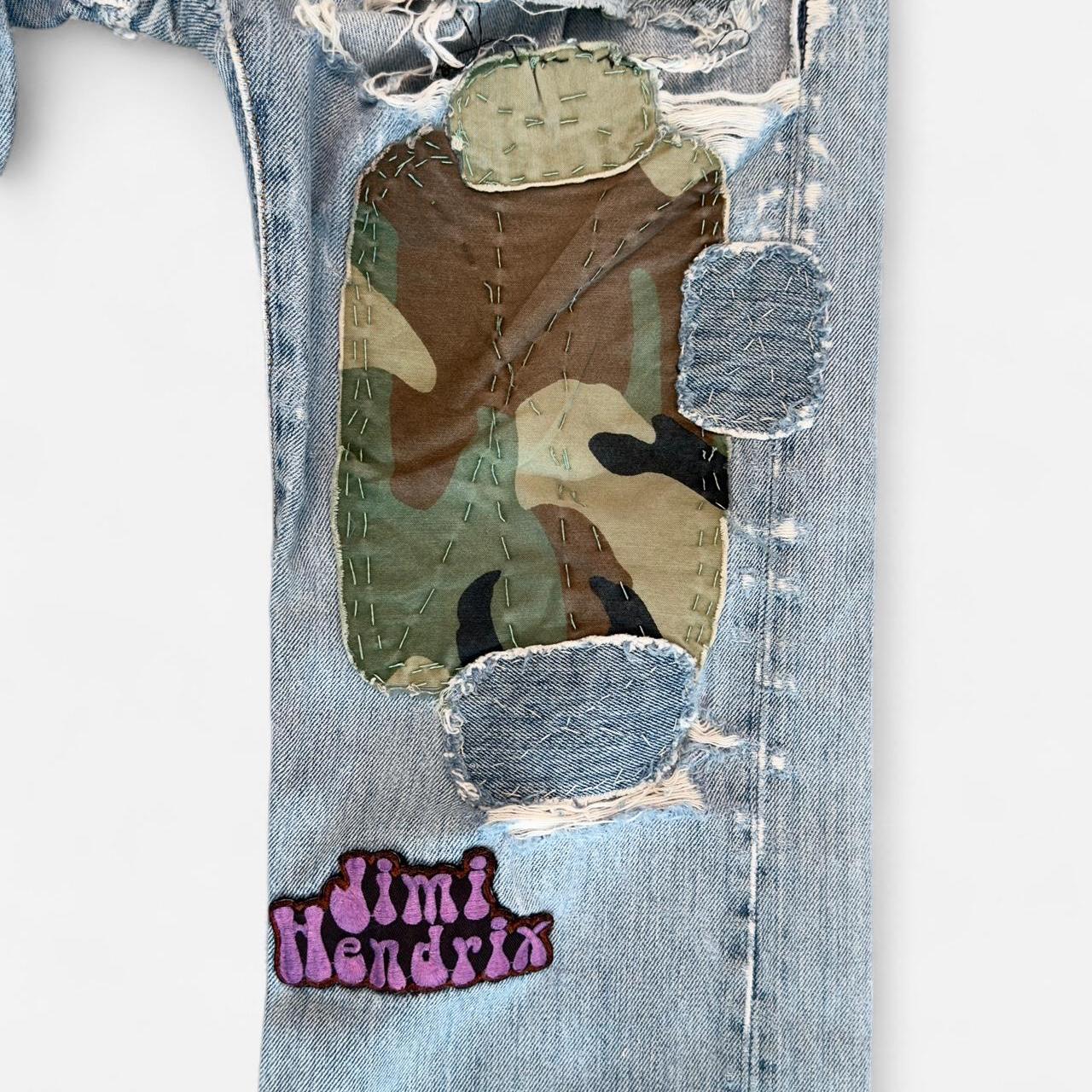 One-of-a-kind reworked Levi’s 501 Original Fit jeans featuring extreme distressing, multi-texture patchwork, camo paneling, and vintage music appliqués (The Beatles + Jimi Hendrix). Each repair area shows visible hand-stitching and layered denim, giving these a true reconstructed Y2K/grunge look.