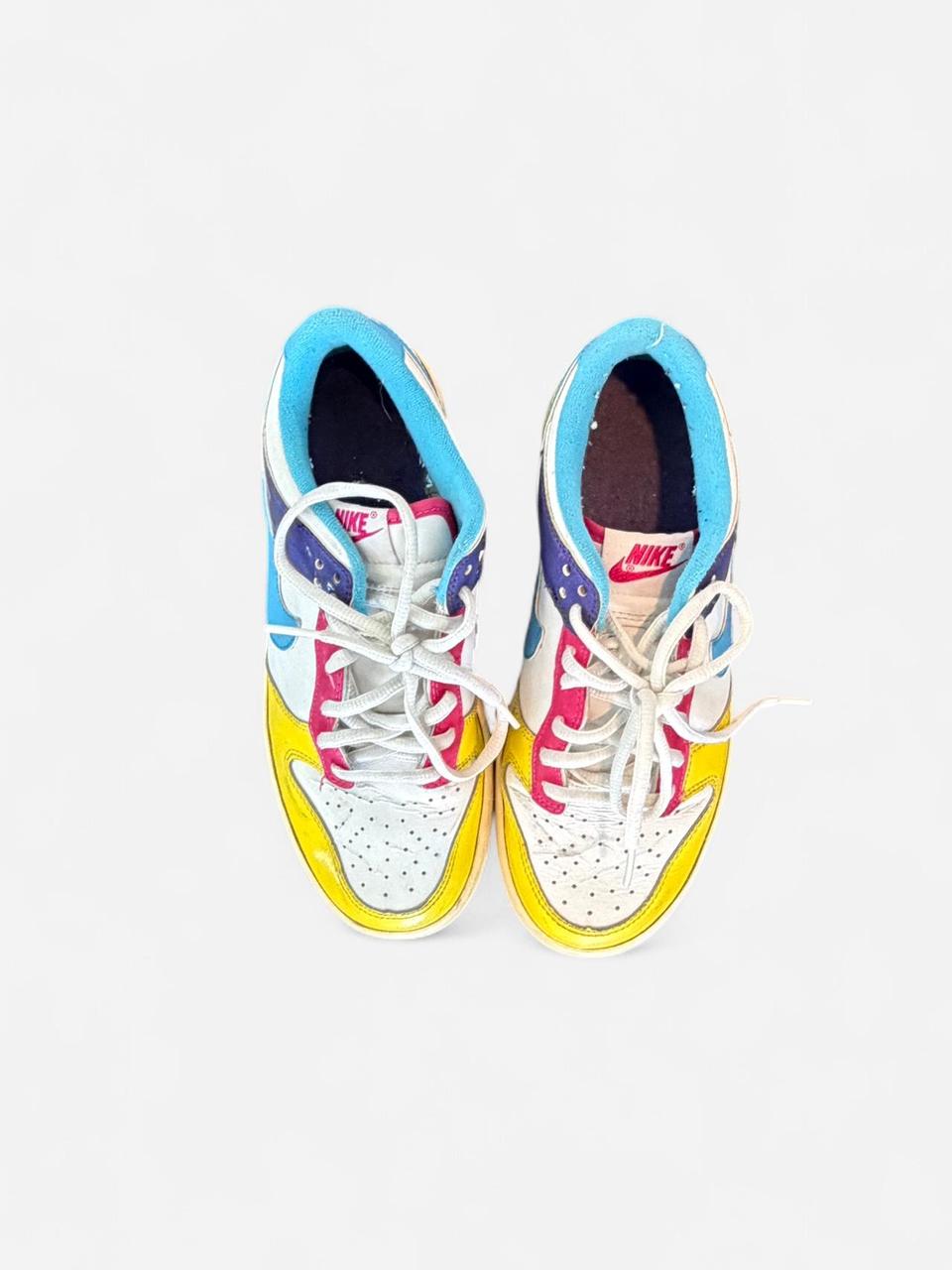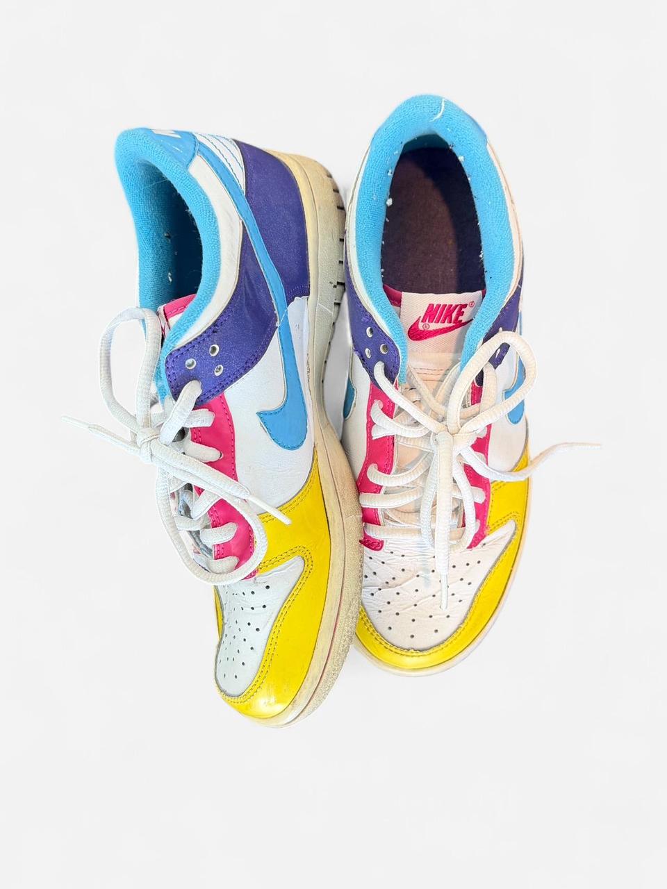 GS “Viotech Inspired” Standout pair of Nike Dunk Lows in a bold, multicolor design. Featuring panels of yellow, blue, purple, pink, and white leather for that true retro vibe. A fun statement sneaker that’s perfect for adding color to any outfit.