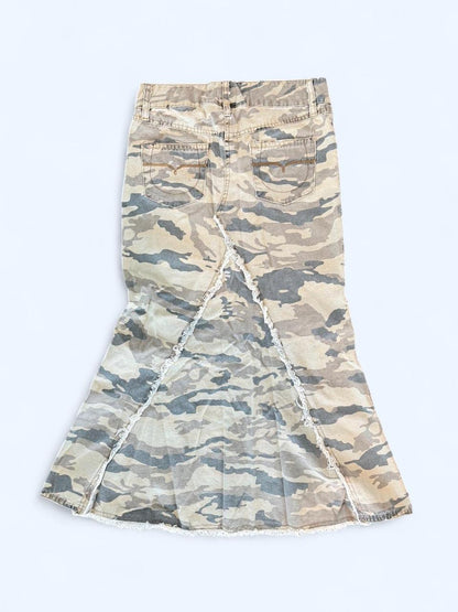 🔥 Rare Y2K-inspired camo maxi skirt with raw hem and distressed seams.